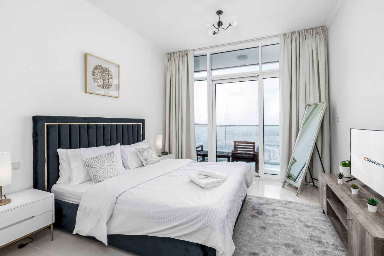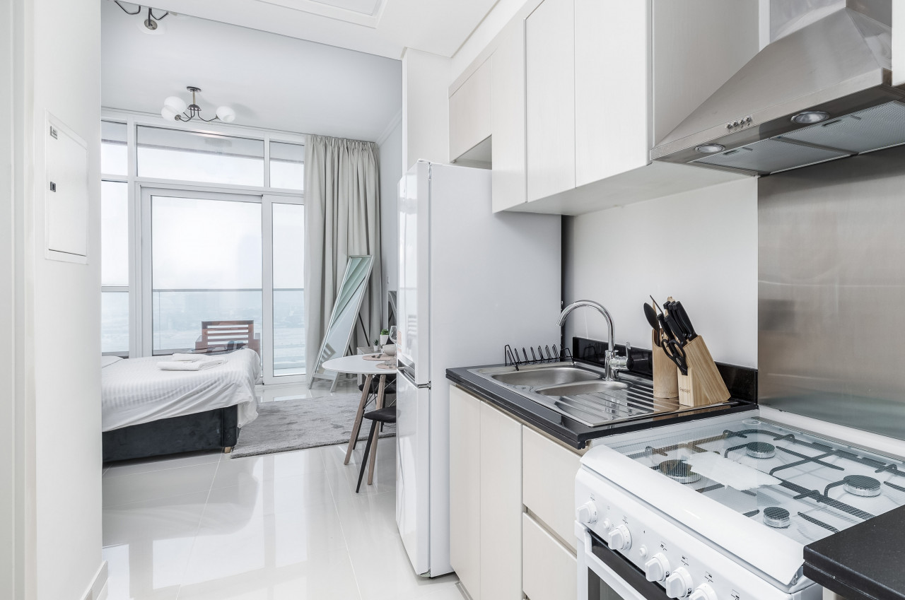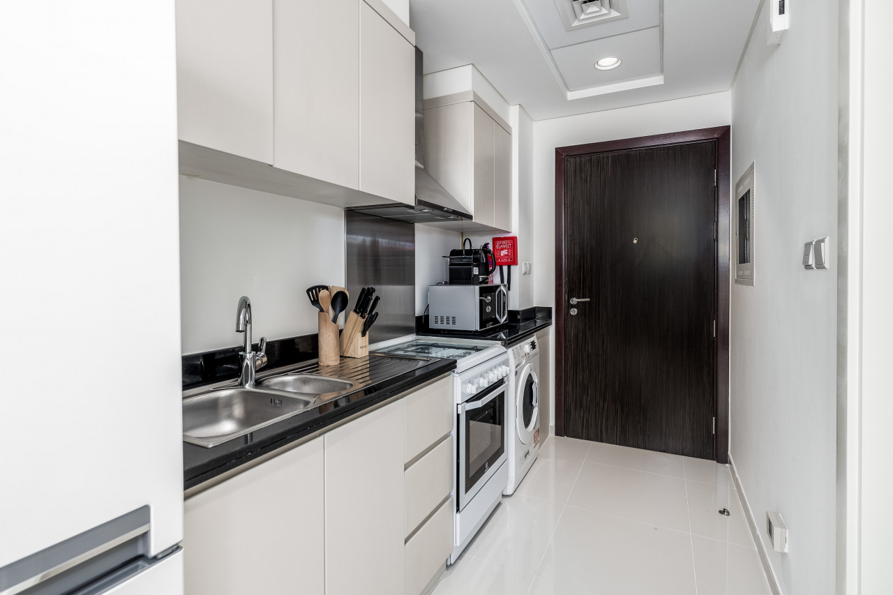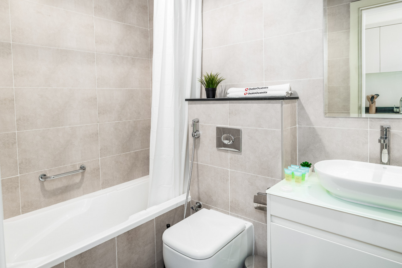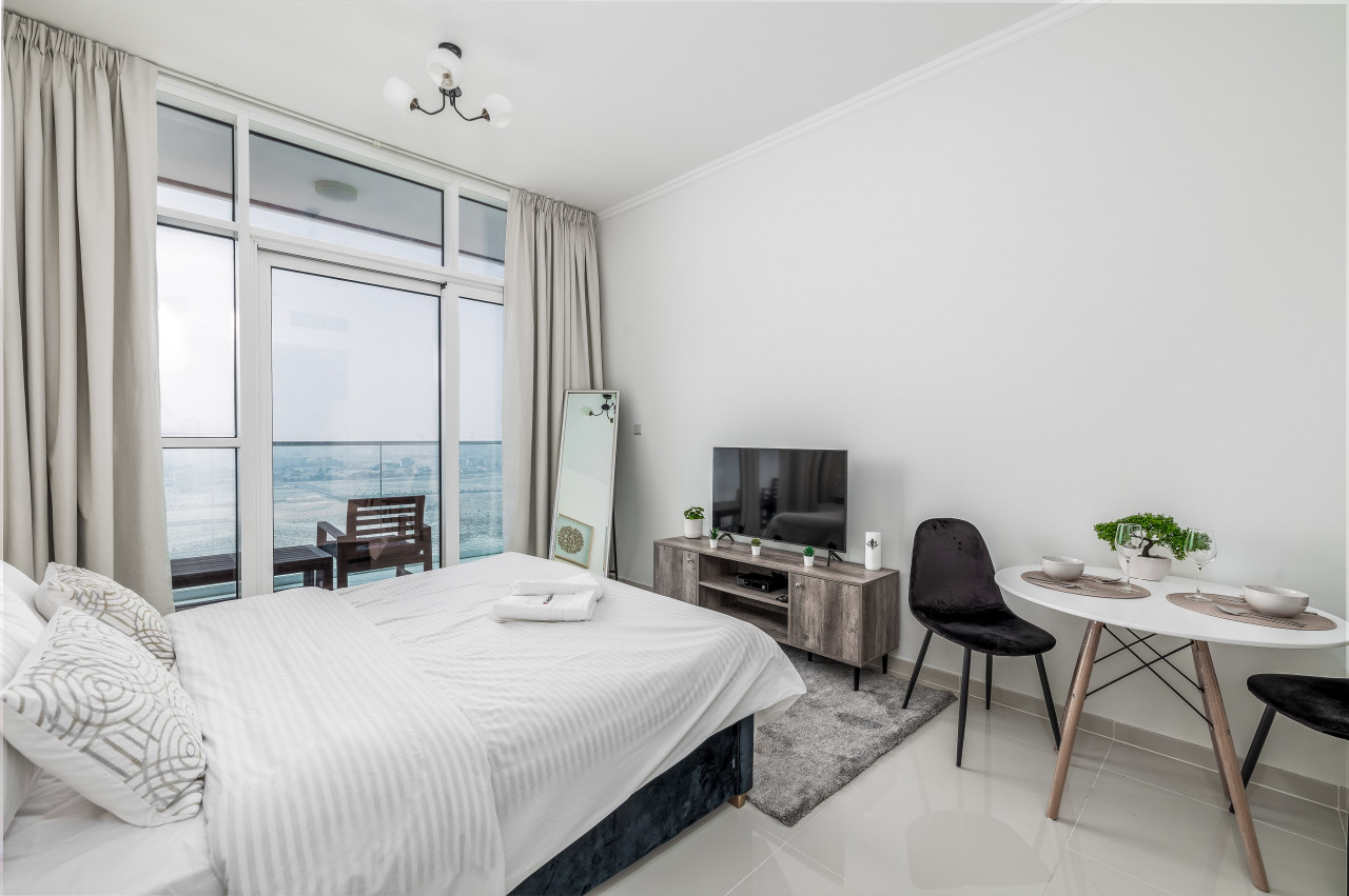By combining beautiful furnishings with neutral colours, this warm urban studio creates a cosy ambiance. The apartment offers a fully furnished bathroom, a kitchen with everything you need, a dining area for two, and a living area with a double bed, a smart TV, and a coffee table. A-Z home appliances are only a few of the smart devices that are available to visitors. This neighbourhood is a part of a big complex with on-site amenities and a golf motif, and guests will have access to them.
