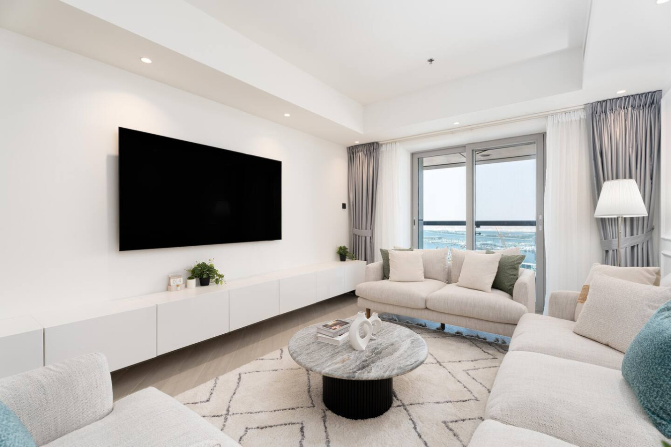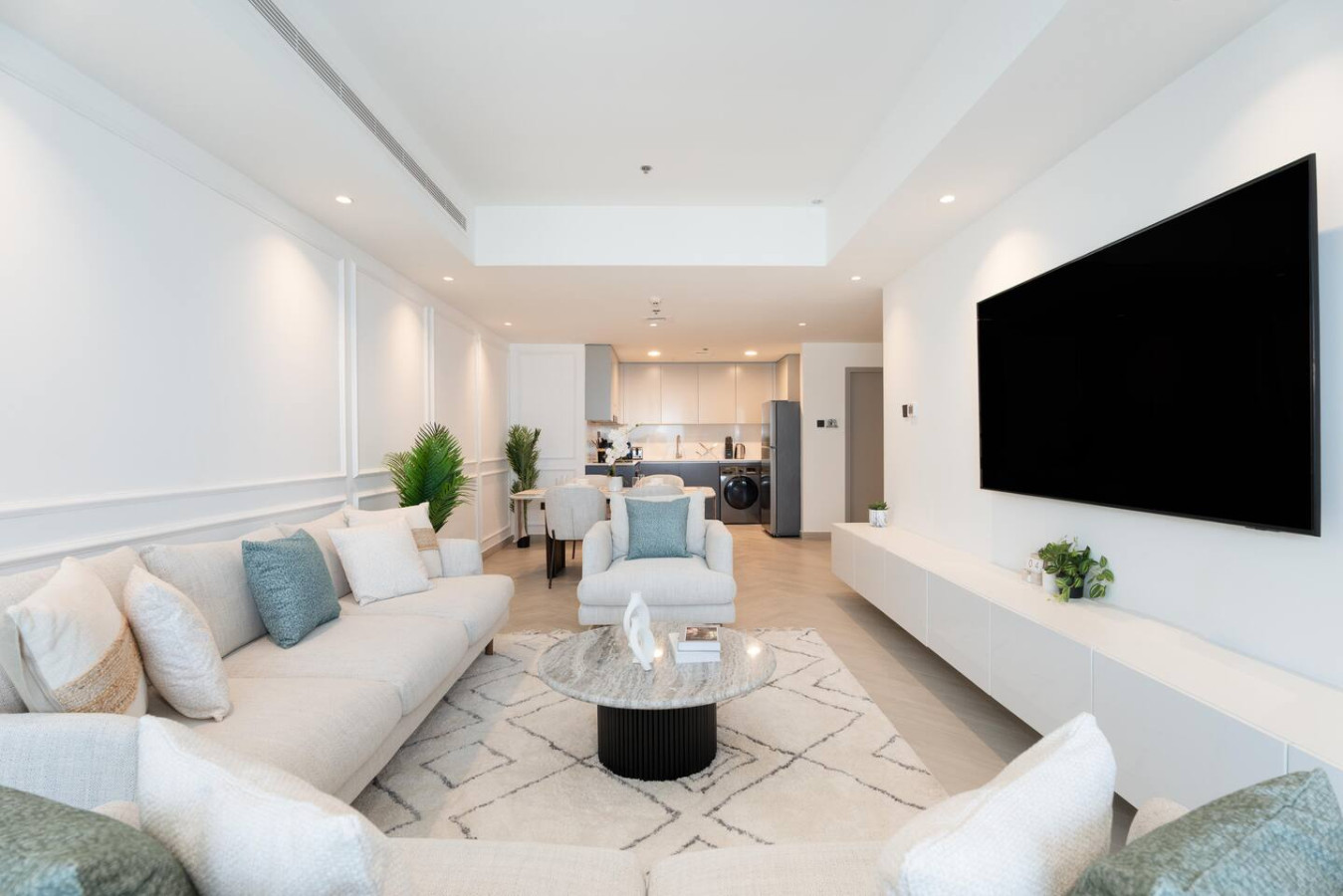The apartment includes a fully equipped kitchen, a dining area, a modern and pleasant living room with a smart TV, a sofa, a coffee table area, 2 bedrooms with a comfortable queen-size bed, and a furnished balcony